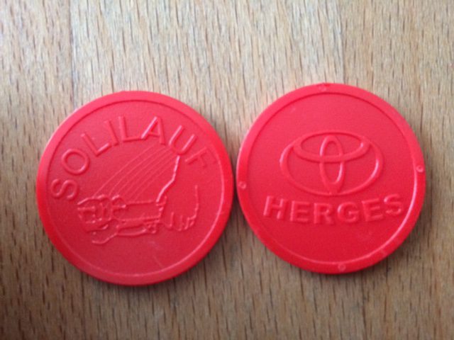Sie sind da. Zum ersten Mal werden am Getränkestand nicht 2€ als Pfand hinterlassen, sondern die original für den Solilauf bedruckten Pfandchips! Und das Beste: Dafür hat sich auch ein Sponsor gefunden: Toyota Herges. Vielen Dank an den Spender.