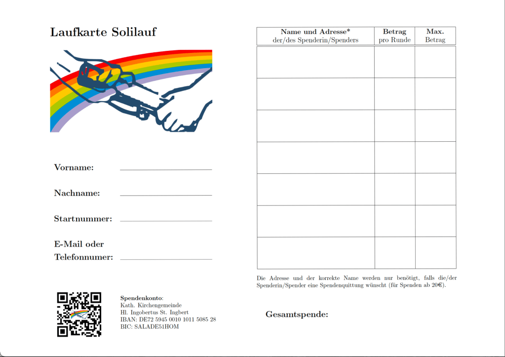 Es wird eine Mindeststartgebühr von 10€ für Erwachsen und 6 € für Kinder und Jugendliche unter 18 Jahren erhoben. Das ist dann deine Grundspende. Zusätzlich werden die Teilnehmer gebeten, bei Verwandten, Nachbarn und Freunden mit Spendenkarten Rundengeld zu sammeln.